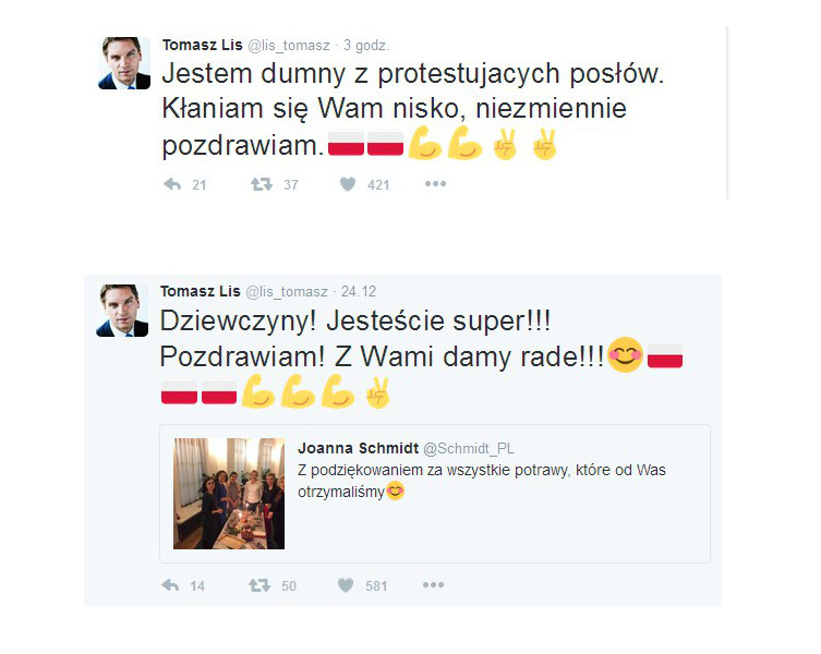 Jako, że Tomasz Lis w tym roku wielokrotnie zabawiał (lub irytował) wiele osób swoimi wpisami na twitterze, nie mogło ich zabraknąć w tym okresie, zwłaszcza, że opozycja święta spędza w Sejmie. Redaktor Tomasz Lis jest z nich, rzecz jasna, dumny. Malo tego, „kłania się im nisko”: