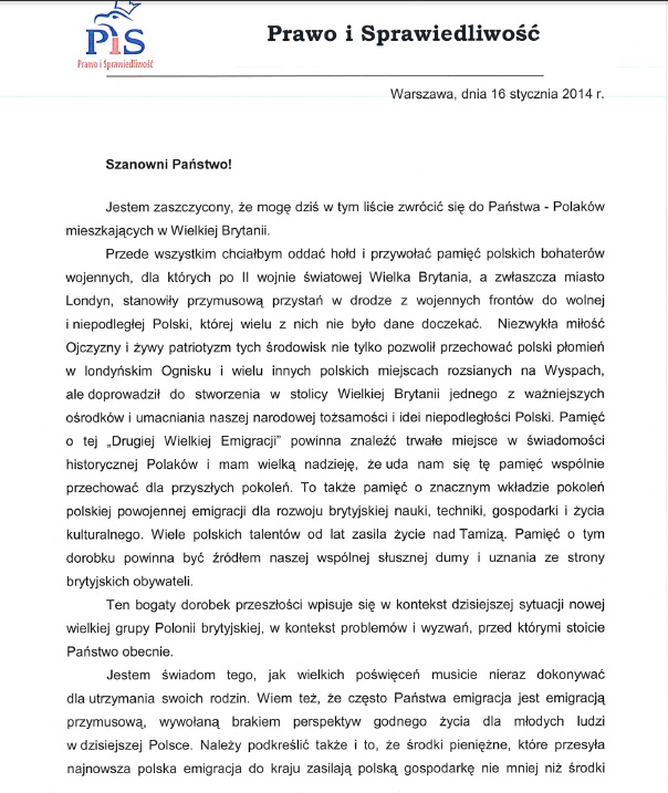 List Prezesa PiS do brytyjskiej Polonii to dowód na to, że partia opozycyjna bardziej dba o swoich rodaków mieszkających na obczyźnie niż rząd Polski. Oczywiście dziś bądź jutro Donald Tusk, by nie być gorszym politykiem i patriotą od Kaczyńskiego, uczyni jakieś kroki w stronę Polaków zamieszkałych w Wielkiej Brytanii, ale to już będzie po fakcie (jak się mówi). Jarosław Kaczyński potrafi reagować szybciej i mądrzej niż nasz Premier. Taki fakt. I trzeba przyznać list jaki skierował do Polaków w Wielkiej Brytanii nie jest monotonny, ani pełen frazesów, ale konkretny.