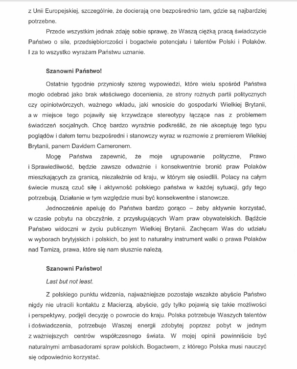 Jendocześnie apeluję do Państwa bardzo gorąco - żeby aktywnie korzystać, w czasie pobytu na obczyźnie, z przysługującym Wam praw obywatelskich. Bądźcie Państwo widoczni w życiu publicznym Wielkiej Brytanii. Zachęcam Was do udziału w wyborach brytyjskich i polskich, bo jest to naturalny instrument walki o prawa Polaków nad Tamizą, prawa, które nam się słusznie należą".