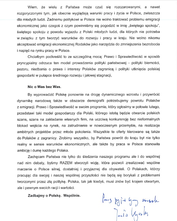 Kaczyński podkreśla, że "Mogę Państwa zapewnić, że moje ugrupowanie polityczne Prawo i Sprawiedliwość, będzie zawsze odważnie i konsekwentnie bronić praw Polaków mieszkających za granicą, niezależnie od kraju, w którym się osiedlili. Polacy na całym świecie muszą czuć siłę i aktywność polskiego państwa w każdej sytuacji, gdy tego potrzebują. Działanie w tym względzie musi być konsekwentne i stanowcze.