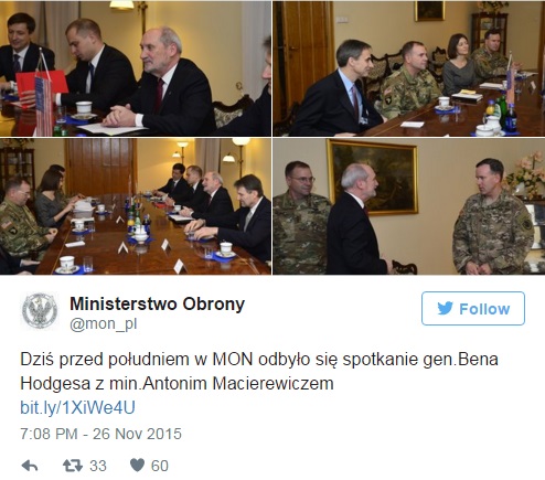 Wcześniej dowódca Wojsk Lądowych USA wziął udział w wystąpieniu publicznym w Centrum Finansowym w Warszawie. Wydarzenie zostało zorganizowane przez think-tank Center for European Policy Analysis. Gen. Hodges zapowiedział, że w czerwcu 2016 roku do Polski i krajów bałtyckich przybędzie 10 do 15 tysięcy amerykańskich żołnierzy.