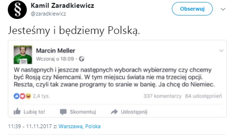 "W następnych i jeszcze następnych wyborach wybierzemy czy chcemy być Rosją czy Niemcami. W tym miejscu świata nie ma trzeciej opcji. Reszta, czyli tak zwane programy to sr***e w banię. Ja chcę do Niemiec."- pisze Meller na Facebooku.