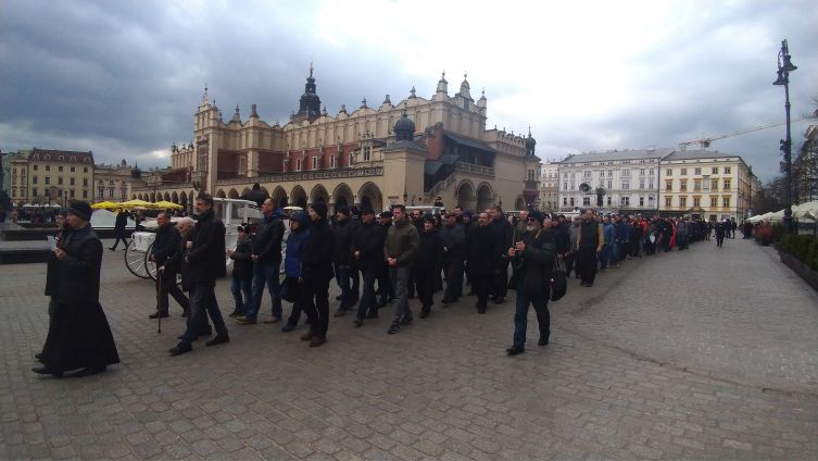 Na placu Mariackim mężczyźni upadli na kolana i odmówili tajemnice bolesne różańca. Obcokrajowcy, którzy tego dnia zwiedzali Kraków z nieukrywanym zainteresowaniem obserwowali Polaków, wiernych synów Kościoła. To dla nich, trzecią tajemnice ksiądz Mariusz poprowadził w języku angielskim.