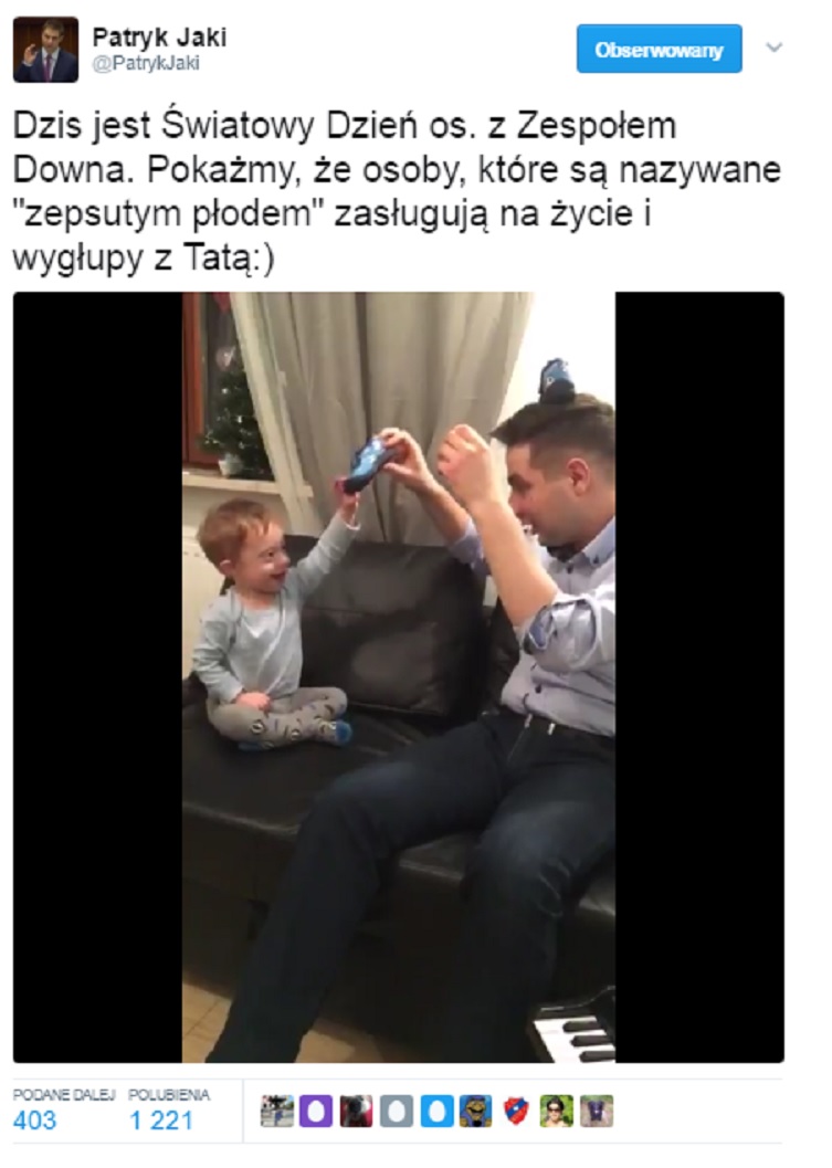 "Dzis jest Światowy Dzień os. z Zespołem Downa. Pokażmy, że osoby, które są nazywane "zepsutym płodem" zasługują na życie i wygłupy z Tatą:)"- napisał na Twitterze sekretarz stanu w Ministerstwie Sprawiedliwości.