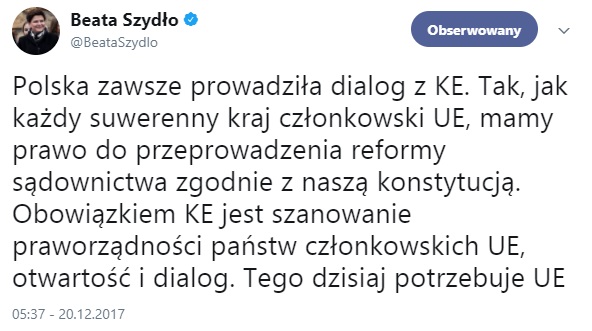 Szydło w swoim tweecie zwróciła uwagę, że Polska jest suwerennym krajem członkowskim Unii Europejskiej, dlatego też ma prawo do przeprowadzenia reformy wymiaru sprawiedliwości.