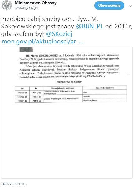 "Przebieg całej służby generała dywizji Marka Sokołowskiego jest znany Biuru Bezpieczeństwa Narodowego od 2011 roku, kiedy szefem BBN był Stanisław Koziej"- podał w komunikacie resort obrony.