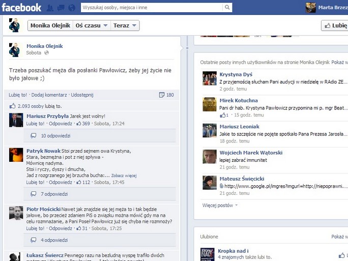 Jeszcze jakoś idzie zrozumieć (bynajmniej, nie wybaczyć), że po tego typu niskich lotów taktykę sięgają anonimowi internauci czy „dziennikarze” podrzędnych mediów, ale najjaśniejsza gwiazda polskiego dziennikarstwa? Wzór stawiany do naśladowania młodym adeptom dziennikarskiej sztuki? Redaktor, która niczego się nie boi (nawet kibiców na stadionach)? Wszak pomysł szukania męża dla prof. Pawłowicz wyszedł od Moniki Olejnik, która na swoim fejsiku napisała: „Trzeba poszukać męża dla posłanki Pawłowicz, żeby jej życie nie było jałowe;)”.