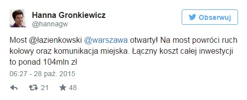 Łączny koszt inwestycji związanej z odbudową wyniósł 104 milinoy złotych. Na dzisiejszym otwarciu mostu za dofinansowanie remontu prezydent Warszawy Hanna Gronkiewicz Waltz podziękowała premier Ewie Kopacz.