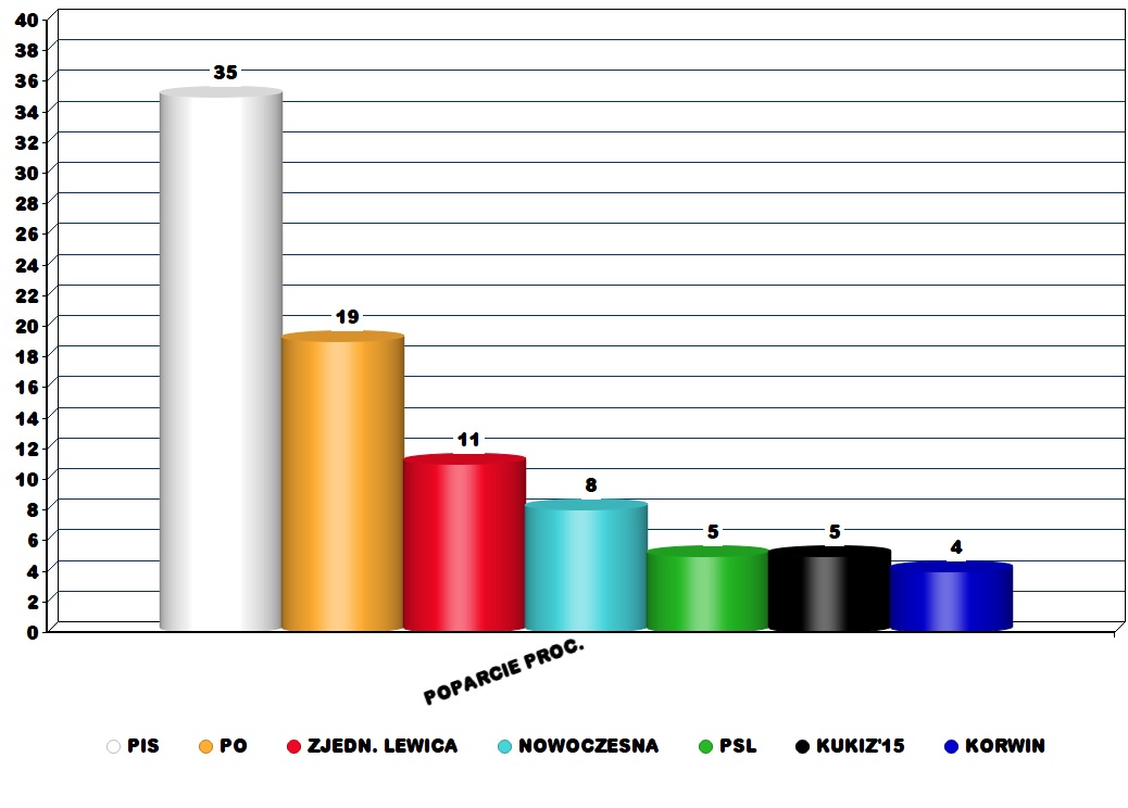 Trzecie miejsce zajęła Zjednoczona Lewica z 11 proc., dalej jest Nowoczesna Ryszarda Petru z 8 proc., w nowym sejmie znalazłyby się też PSL i Kukiz'15 z 5 proc.