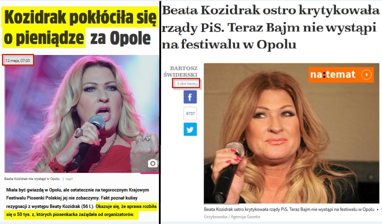 "Beata Kozidrak ostro krytykowała rządy PiS. Teraz Bajm nie wystąpi na festiwalu w Opolu" - brzmi tytuł artykułu, który ukazał się na portalu "NaTemat".