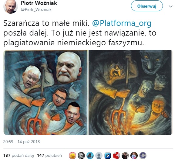 Dehumanizacja PiS w obozie opozycji totalnej to w sumie nic nowego. Problem w tym, że Furgo opublikował... przeróbkę nazistowskiego, propagandowego plakatu z czasów II wojny światowej. "Złe duchy ponad Twym domem. Pracuj z Niemcami, a zostaniesz uratowany"- brzmi podpis pod oryginalną grafiką. Trzeba przyznać, że to dość ciekawe posunięcie, jak na posła partii, która wszędzie widzi faszyzm i nazizm oraz zarzuca politykom PiS wspieranie neonazistów/przymykanie oczu na ich szkodliwą działalność.