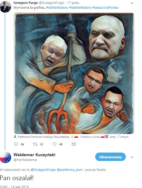 "Wszystkich którzy zostali urażeni przepraszam"-dodaje Furgo w najnowszym wpisie na Twitterze. Wielu internautów uważa jednak, że usunięcie obrzydliwej przeróbki oraz twitt z przeprosinami niczego nie załatwiają. Użytkownicy Twittera nawiązują również do innych wypowiedzi polityków Platformy Obywatelskiej, dehumanizujących przeciwników politycznych, takich jak chociażby sławetna "szarańcza" Grzegorza Schetyny. Swoją drogą ciekawe czy partia wyciągnie wobec posła Furgo jakieś konsekwencje, choć dopiero co w podobnie skandalicznym tonie wypowiedział się sam lider PO...