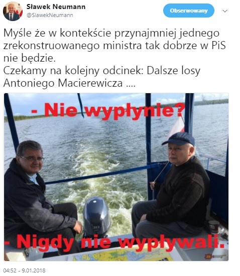 "Myślę, że w kontekście przynajmniej jednego zrekonstruowanego ministra tak dobrze w PiS nie będzie. Czekamy na kolejny odcinek: Dalsze losy Antoniego Macierewicza..."- napisał szef klubu parlamentarnego PO. Wpis był komentarzem do załączonego zdjęcia. Widać na nim prezesa PiS, Jarosława Kaczyńskiego na łódce.