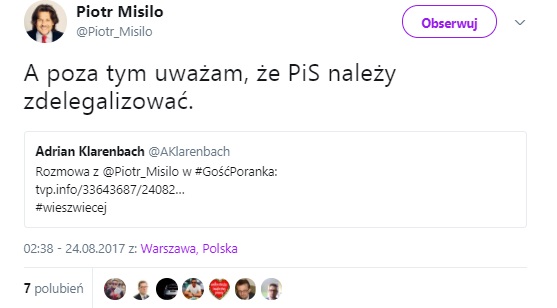 Poseł Nowoczesnej stwierdził również, że PiS powinno się zdelegalizować. Tę myśl powtórzył na swoim profilu na Twitterze.