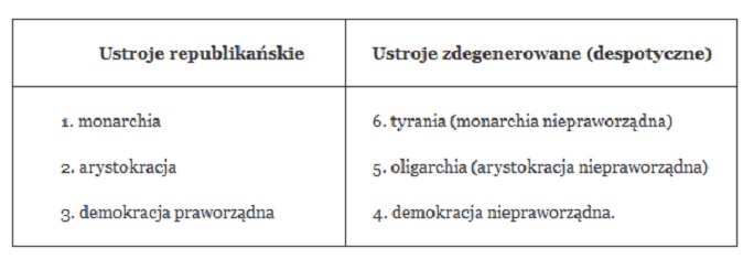 Trzy ustroje, w których rządzący troszczą się o dobro wspólne, prezentując tym samym postawę „republikańską”, to – używając terminologii Arystotelesa[6] – ustroje właściwe, trzy pozostałe, gdzie rządzą pojedynczo lub grupowo despoci – ustroje zdegenerowane. Zgodnie z ujęciem Platona okazuje się zatem, że również państwo rządzone przez króla może być republiką. Choć takie twierdzenie zadziwiłoby zapewne wielu nowożytnych republikanów, było ono przecież czymś oczywistym w Polsce w czasach rzeczpospolitej szlacheckiej, która skądinąd do końca swojego istnienia pozostawała jednocześnie monarchią.