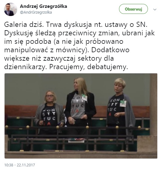 Straż Marszałkowska poprosiła widoczne na poniższych zdjęciach kobiety o zdjęcie koszulek z napisem "KONSTYTUCJA" ze względu na zakaz agitacji w Sejmie. Działaczki KOD odmówiły i mimo wszystko zostały wpuszczone na galerię.