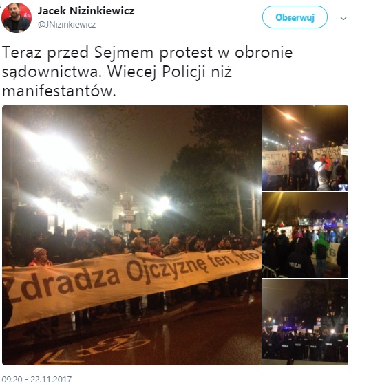 Przeciwnicy zmian w sądownictwie protestowali także pod budynkiem Sejmu. Zdaniem dziennikarza "Rzeczpospolitej", Jacka Nizinkiewicza, pod Sejmem było "więcej policji, niż manifestantów".