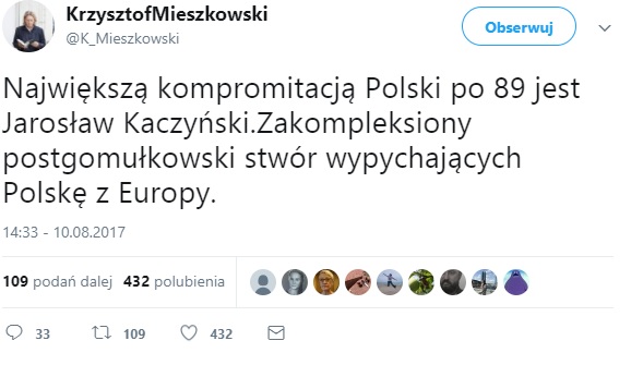"Największą kompromitacją Polski po 89 jest Jarosław Kaczyński. Zakompleksiony postgomułkowski stwór wypychających Polskę z Europy"- napisał na Twitterze były dyrektor Teatru Polskiego we Wrocławiu. Pisownia oryginalna.