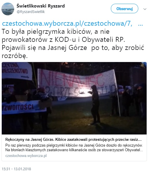 "To była pielgrzymka kibiców, a nie prowokatorów z KOD-u i Obywateli RP. Pojawili się na Jasnej Górze po to, aby zrobić rozróbę"- napisał użytkownik, który zamieścił link do artykułu na Twitterze.