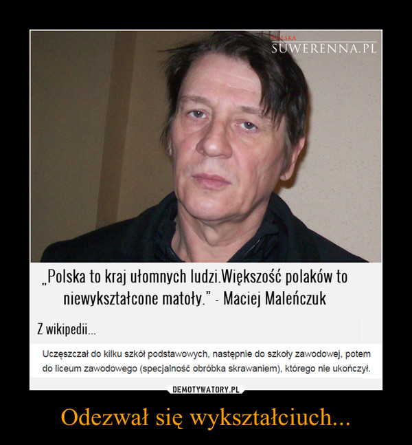 "Polska to kraj ułomnych ludzi. Większość Polaków to niewykształcone matoły nadające się tylko do kopania mojej działki". Mówił to człowiek bez matury. Człowiek, który nie ukończył liceum zawodowego, a nawet szkoły podstawowe zmieniał kilkakrotnie.