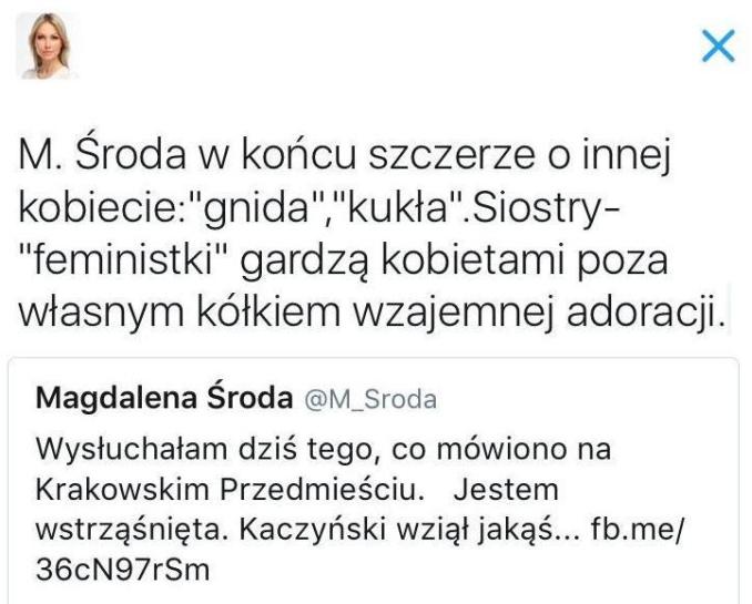 „M. Środa w końcu szczerze o innej kobiecie: „gnida”, „kukła”. Siostry „feministki” gardzą kobietami poza własnym kółkiem wzajemnej adoracji”.
