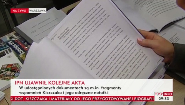Marta Matuszak z TVP Info która przegląda udostępnione przez Instytut materiał powiedziała:– Tych dokumentów jest zdecydowanie więcej niż w poniedziałek. Wśród materiałów są m.in. fragmenty książki o generale Czesławie Kiszczaku. To są fragmenty z ręcznymi adnotacjami.[…] Jest też broszura ze zdjęciami, na których pojawia się m.in. gen. Wojciech Jaruzelski, gen. Czesław Kiszczak, Bronisław Geremek na mównicy sejmowej oraz Adam Michnik. Teraz będziemy przeglądać te dokumenty – informował korespondentka TVP Info.