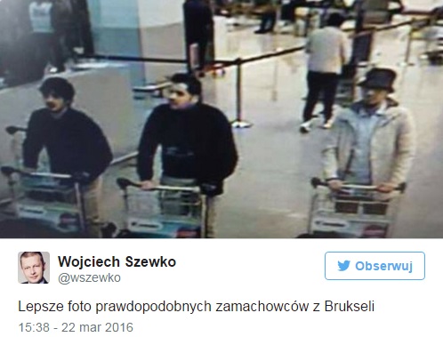 Portal dh.he opublikował zdjęcie z nagrania z lotniska Zaventem. Widać na nim kilku mężczyzn. Wg dostępnych informacji to właśnie oni są odpowiedzialni za dzisiejsze wybuchy w metrze w Brukseli oraz na lotnisku.