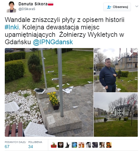 Kolejny akt wandalizmu w Gdańsku, wymierzony w obiekty upamiętniające Żołnierzy Wyklętych. W zeszłym tygodniu zdewastowano mural poświęcony mjr. Łupaszce, dziś zniszczona została tablica przy pomniku upamiętniającym postać "Inki".