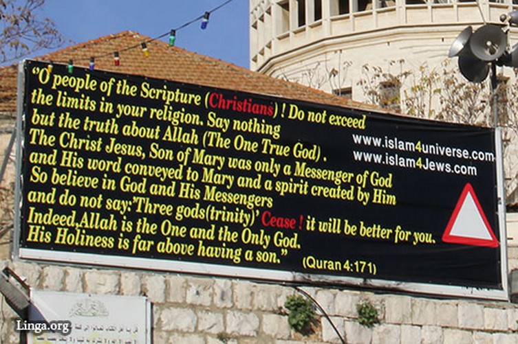 O ludu Księgi! Nie przekraczaj granic w twojej religii i nie mów o Bogu niczego innego, jak tylko prawdę! Mesjasz, Jezus syn Marii, jest tylko posłańcem Boga; i Jego Słowem, które złożył Marii; i Duchem, pochodzącym od Niego. Wierzcie więc w Boga i Jego posłańców i nie mówcie: "Trzy!" Zaprzestańcie! To będzie lepiej dla was! Bóg- Allah - to tylko jeden Bóg! On jest nazbyt wyniosły, by mieć syna! Do Niego należy to, co jest w niebiosach, i to, co jest na ziemi. I Bóg wystarcza jako opiekun! (źródło: Koran, tłumaczenie J. Bielawski, Warszawa 1986). A oto plakat: