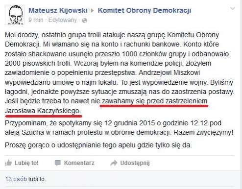 Niesiołowski, Kijowski, który jeszcze z przegranych podniesie rękę na Polskę? Pan Mateusz Kijowski, jeden z inicjatorów powstania Komitetu Obrony Demokracji (placówki Gazety Wyborczej) wzywa do zastrzelenia Jarosława Kaczyńskiego. Wpis wprawdzie usunięto, ale 13 osób w ciągu 9 minut zdążyło go polubić... Składam zawiadomienie do Prokuratury.