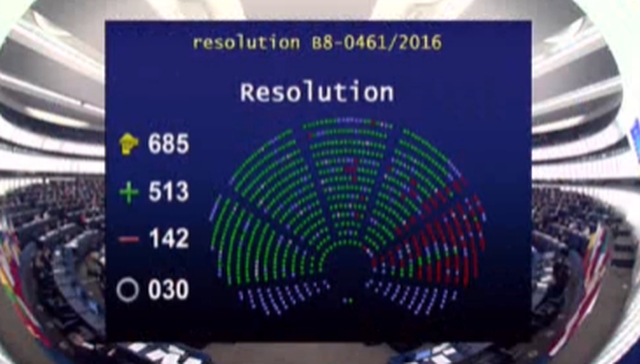 Krytyczna wobec działań rządu Polski rezolucja Parlamentu Europejskiego została przyjęta na głosowaniu w Strasburgu. Za było 513 eurodeputowanych, przeciwko głosowało 142. Rezolucja wzywa m.in. polski rząd do publikacji wyroku Trybunału Konstytucyjnego.