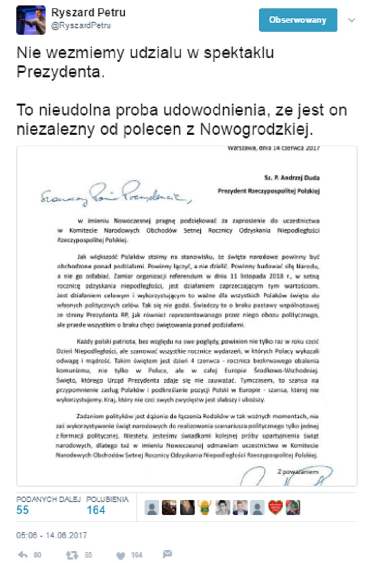 "W imieniu Nowoczesnej pragnę podziękować za zaproszenie do uczestnictwa w Komitecie Narodowych Obchodów Setnej Rocznicy Odzyskania Niepodległości Rzeczypospolitej Polskiej (…) Niestety jesteśmy świadkami kolejnej próby upartyjnienia świąt narodowych, dlatego też w imieniu Nowoczesnej odmawiam uczestnictwa w Komitecie"- napisał poseł w liście do prezydenta Dudy. Następnie dodał, że święta narodowe powinny Polaków łączyć, a nie dzielić, powinny odbywać się ponad podziałami i budować siłę narodu. Zdaniem Petru, propozycja prezydenta dotycząca zorganizowania w setną rocznicę odzyskania przez Polskę niepodległości, referendum dotyczącego Konstytucji, „jest działaniem zaprzeczającym tym wartościom”.