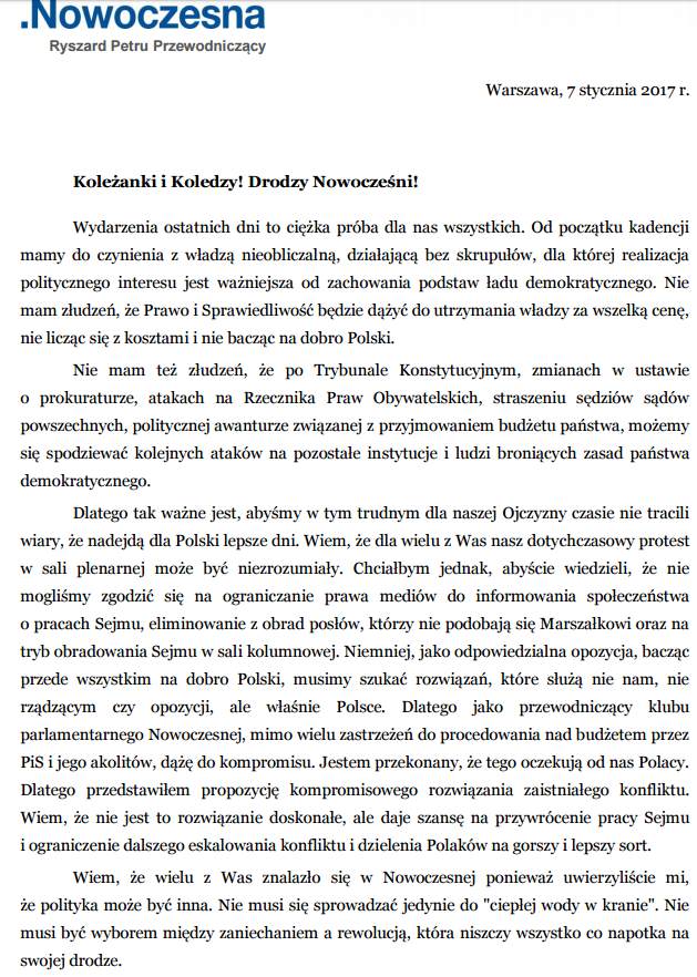 Do listu, jaki Petru wysłał do partii, dotarł portal 300polityka.pl. Ryszard Petru napisał w liście, że Nowoczesna będzie szukać rozwiązań kryzysu w parlamencie, bo jest „odpowiedzialną opozycją”. „Bacząc przede wszystkim na dobro Polski musimy szukać rozwiązań, które służą nie nam, nie rządzącym czy opozycji, ale właśnie Polsce” - podkreślił.
