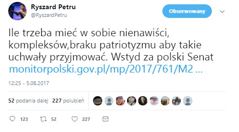 "Ile trzeba mieć w sobie nienawiści, kompleksów, braku patriotyzmu aby takie uchwały przyjmować. Wstyd za polski Senat"- grzmi na Twitterze lider Nowoczesnej. Jakaż to uchwała aż tak rozwścieczyła Ryszarda Petru?