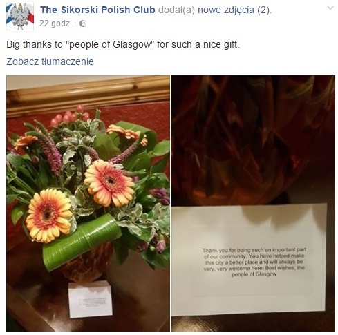 Do Domu Polskiego w Glasgow anonimowy nadawca dostarczył kwiaty, a także krótki list, w którym dziękował Polakom za ich obecność w jednym z największych szkockich miast.