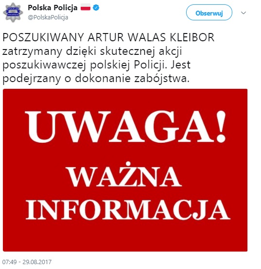 Łódzka Komenda Wojewódzka Policji wyznaczyła wcześniej nagrodę w wysokości 15 tysięcy złotych za informacje, które pomogą w zatrzymaniu Artura Walasa Kleibora.