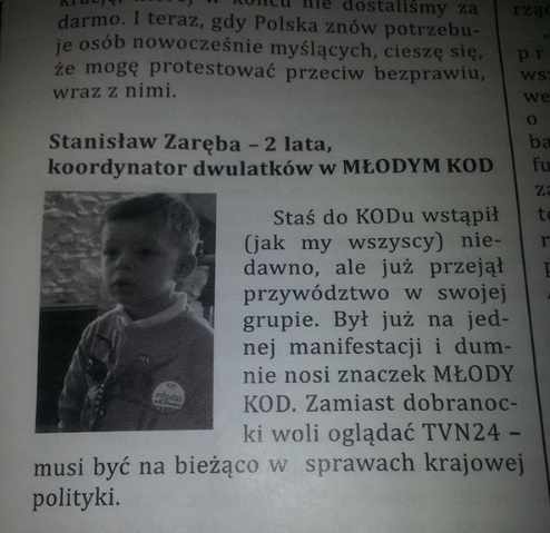 Jak możemy dowiedzieć się z biuletynu KOD, którego fragment opublikował na Twitterze jeden z dziennikarzy "Faktu", mały Staś Zaręba mimo młodego, bo liczącego zaledwie dwie wiosny wieku, już przejął przywództwo w swojej grupie dwulatków.