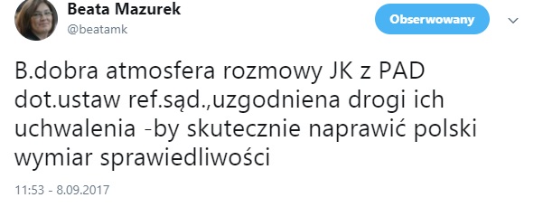 "B.dobra atmosfera rozmowy JK z PAD dot.ustaw ref.sąd.,uzgodniena drogi ich uchwalenia -by skutecznie naprawić polski wymiar sprawiedliwości"- napisała Mazurek. Polityk PiS potwierdziła to również w rozmowie z TVP Info. Rozmowa dotyczyła prezydenckich propozycji ustaw o SN i KRS. Duda i Kaczyński chcieli ustalić drogi ich uchwalenia.