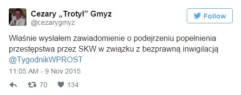 Inwigilowany był również dziennikarz śledczy "Do Rzeczy" i Telewizji Republika Cezary Gmyz, autor kilku publikacji dotyczących afery podsłuchowej. Gmyz poinformował na Twitterze, że w związku informacjami podanymi przez "Wprost" złożył zawiadomienie o podejrzeniu popełnienia przestępstwa przez SKW.