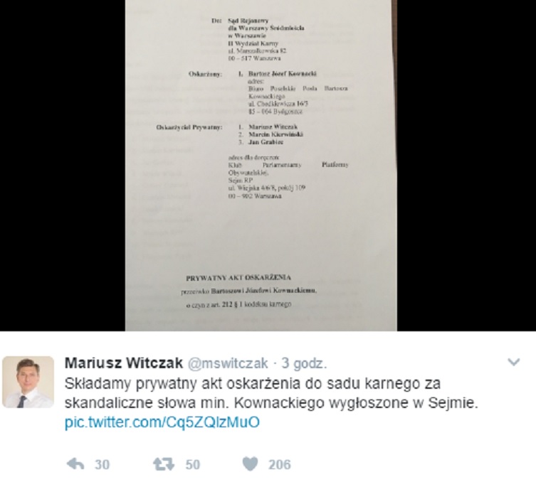 Trzech posłów Platformy Obywatelskiej, Jan Grabiec, Mariusz Witczak i Marcin Kierwiński poinformowali podczas konferencji prasowej w Sejmie, że złożyli prywatny akt oskarżenia przeciwko sekretarzowi stanu w MON i posłowi Prawa i Sprawiedliwości.