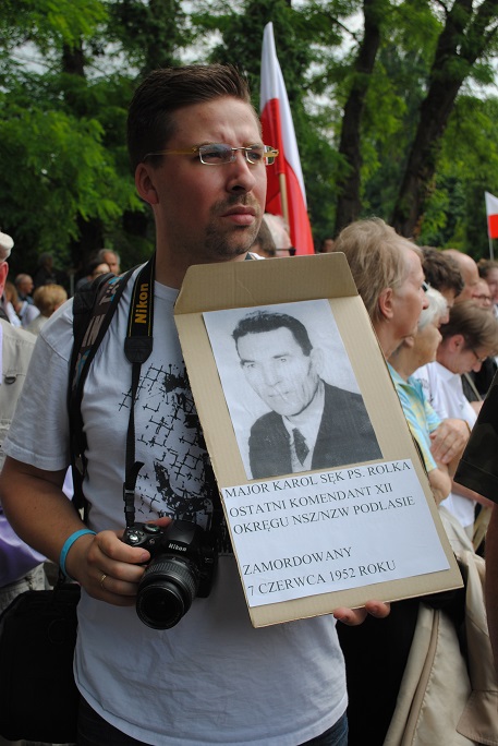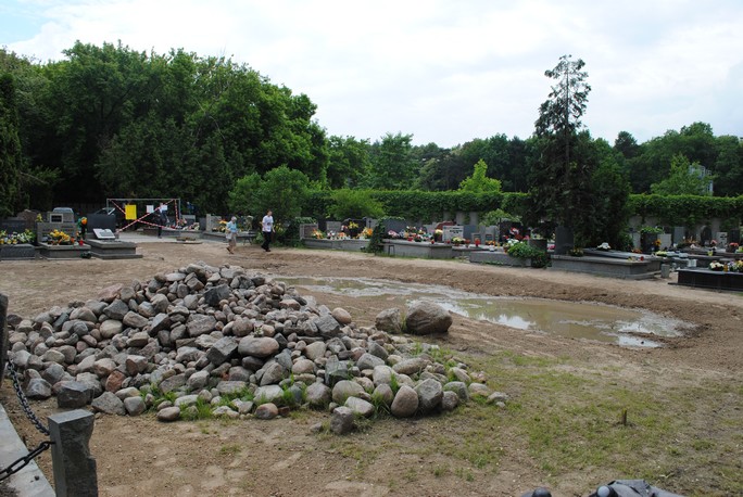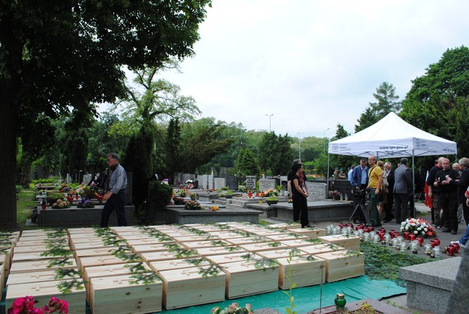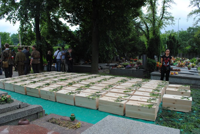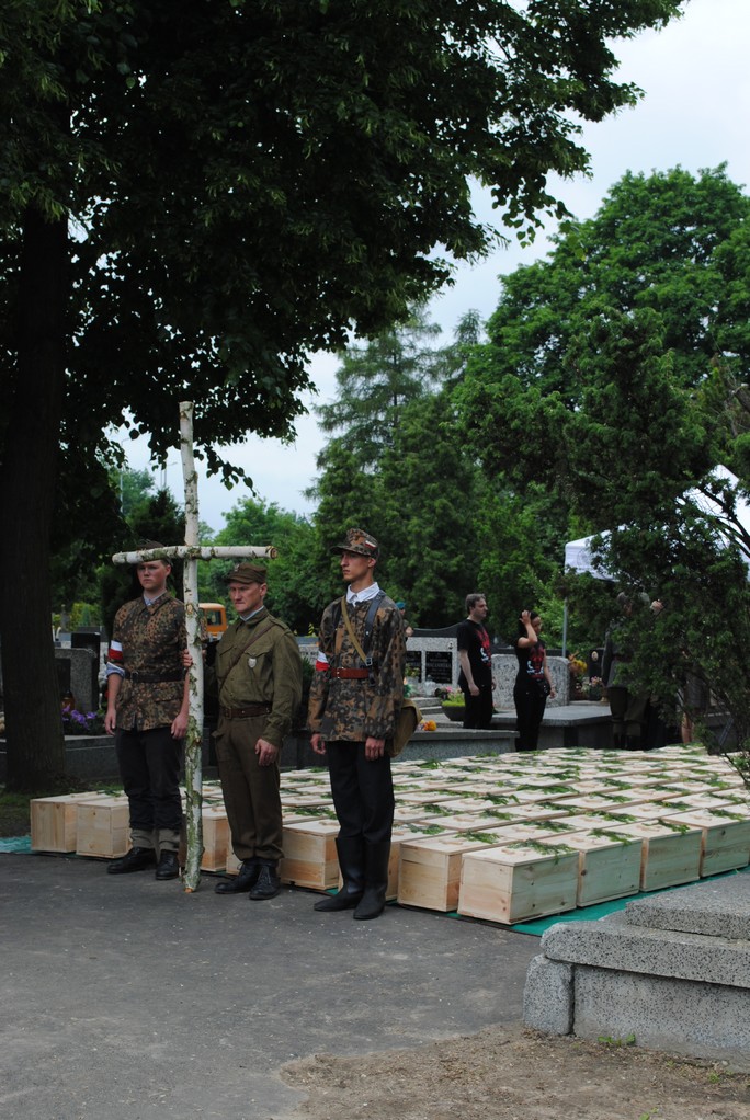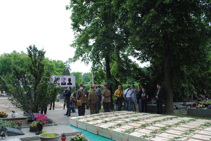 Tuż przy miejscu ekshumacji, gdzie przez ponad 60 lat spoczywały szczątki bestialsko pomordowanych stanęły rzeczy kilkudziesięciu trumien. Warta honorowa, poczty sztandarowe, obok krzesła dla rodzin Zmarłych i ich Przyjaciół- często ludzi już bardzo podeszłych wiekiem. Czekali na tę chwilę prawie całe swoje życie. Niektórzy wiedzą, w której trumnie spoczywają ich Najbliżsi, inni muszą jeszcze poczekać, mają nadzieję, że w jednej z tych prostych skrzynek spoczywają prochy Ojca, Brata, Przyjaciela. Kombatanci udzielają wywiadów- dolatują słowa- stoję przed człowiekiem, który o rotmistrzu Pileckim, mówi per „Witek”… Na bannerze twarze: Bolesław Budelewski, Stanisław Abramowski, Stanisław Kasznica, Stanisław Łukasik, Tadeusz Pelak, Eugeniusz Smoliński, Eugeniusz Bukowski i wielokropek dla tych, których nie sposób jeszcze wymienić ale, jak zapewnili mówcy, i oni odzyskają swoje imię i grób. Nad portretami ofiar słowa: „Polska się o nich upomniała”. Przed trumnami warta honorowa pod skromnym i wymownym brzozowym krzyżem.