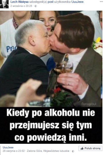 Chodzi o fotomontaż, który Wałęsa udostępnił na swoim profilu na Facebooku. Widać na nim prezydenta Dudę w namiętnym pocałunku z prezesem PiS. Jeżeli dobrze przyjrzeć się zdjęciu, zobaczymy, że Jarosław Kaczyński ma siwe włosy i widać, że fotografia została wykonana całkiem niedawno, zaś Andrzej Duda wygląda jak żywcem wyjęty z lat 90. Jest to bowiem fotomontaż.