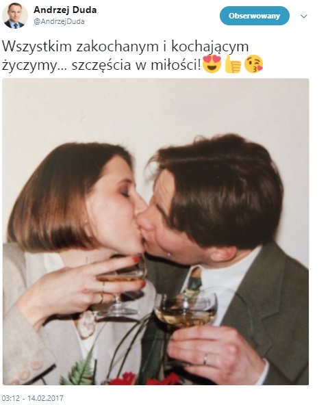 Chociaż fotografia Jarosława Kaczyńskiego jest stosunkowo aktualna, o tyle zdjęcie Dudy faktycznie zostało zrobione w latach 90., na co wskazuje chociażby fryzura dzisiejszego prezydenta. Tyle że na oryginalnej fotografii nie całuje prezesa PiS, ale swoją żonę. Prezydent opublikował tę fotografię na Twitterze z okazji tegorocznych Walentynek.