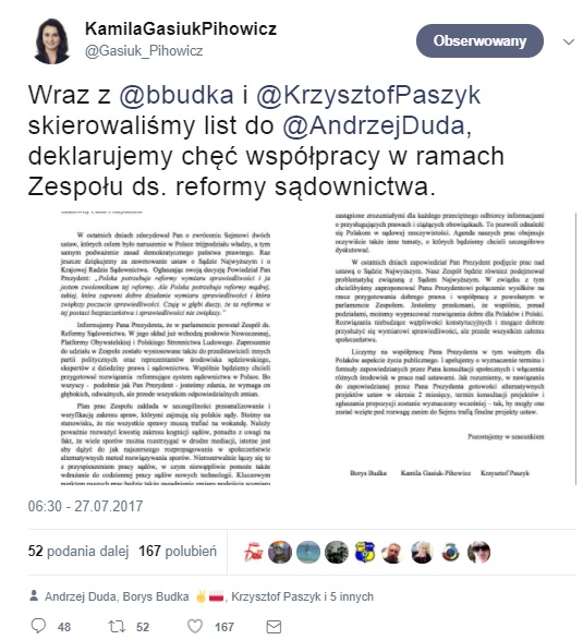 Posłanka Nowoczesnej, Kamila Gasiuk-Pihowicz poinformowała, że wraz z parlamentarzystami Platformy Obywatelskiej i PSL: Borysem Budką oraz Krzysztofem Paszykiem, napisała list do prezydenta Andrzeja Dudy.