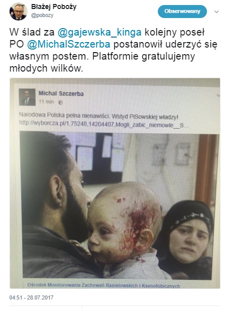 „Prawdziwi Polacy pokazują światu naszą gościnność...”- napisała posłanka PO, Kinga Gajewska, udostępniając post na Facebooku. Polityk pośrednio obarczyła winą szefa MSWiA, Mariusza Błaszczaka. Tymczasem zdjęcie zamieszczone na stronie Ośrodka zostało zrobione w Syrii. „Zdjęcie ilustrujące materiał nie zostało wykonane w Białymstoku, ma charakter wyłącznie ilustracyjny”- podkreślono w poście. Tyle że informacja znajduje się na samym jego końcu.
