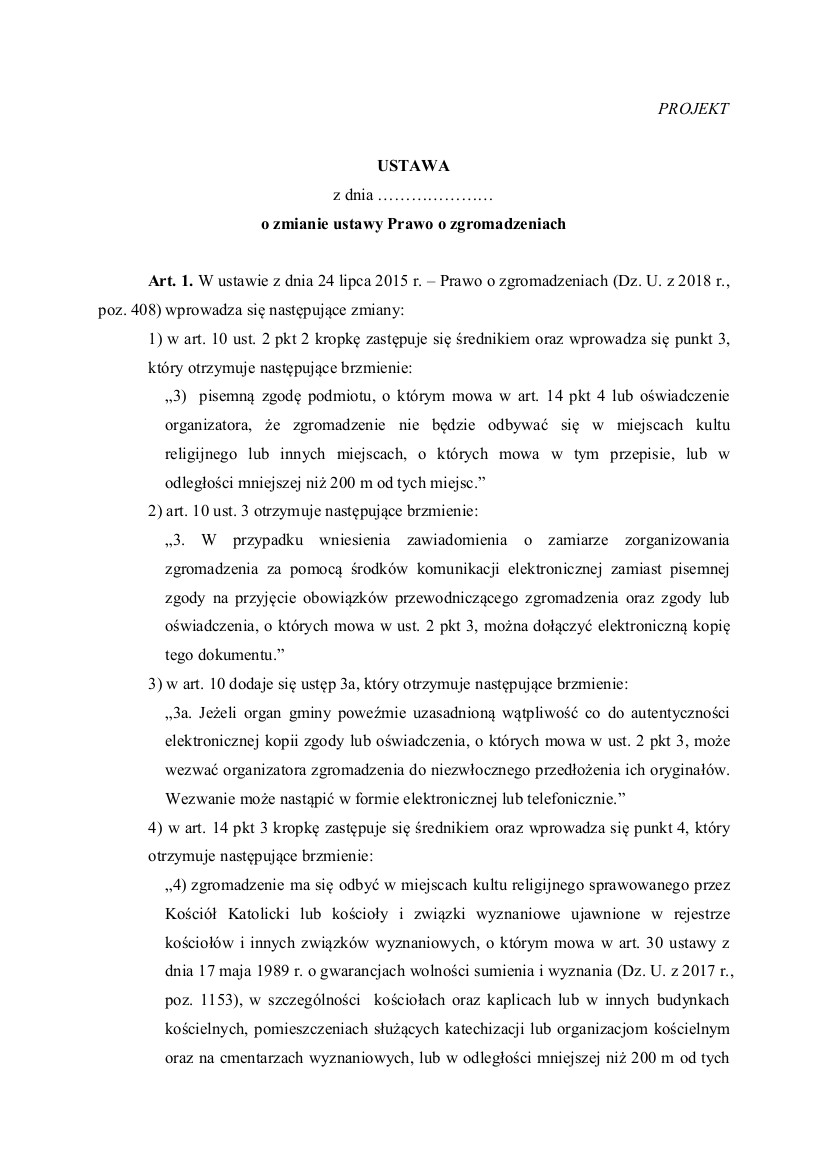 W środę 13 czerwca 2018 r. Prawica Rzeczypospolitej zaprezentowała w Sejmie RP projekt nowelizacji Prawa o zgromadzeniach. Jego celem jest zapewnienie należytej ochrony prawnej kościołom i związkom wyznaniowym, jak również wiernym tych wspólnot religijnych, poprzez uniemożliwienie zakłócania sprawowania kultu przez manifestacje o charakterze politycznym.