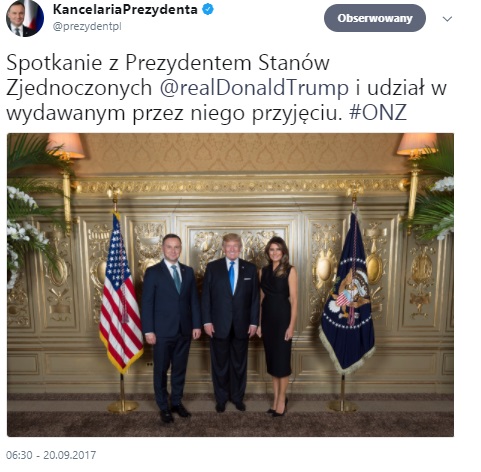 Prezydent spotkał się z amerykańskimi biznesmenami, przedstawicielami świata nauki, Polonią w USA, a także- z prezydentem USA, Donaldem Trumpem oraz jego żoną Melanią. Pałac Prezydencki zamieścił na Twitterze wspólne zdjęcie prezydenta Dudy z amerykańską Parą Prezydencką. Jak zdradził prezydencki minister, Krzysztof Szczerski, Melania Trump liczyła przy tej okazji na spotkanie z polską pierwszą damą, jednak Agata Kornhauser-Duda miała tym razem inne obowiązki w Warszawie.