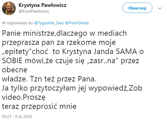 "Jak zwykle dał się podpuścić i na ślepo przeprasza za innych"- napisała na Twitterze. Następnie zwróciła się do wicepremiera z pytaniem: "dlaczego w mediach przeprasza pan za rzekome moje 'epitety' "