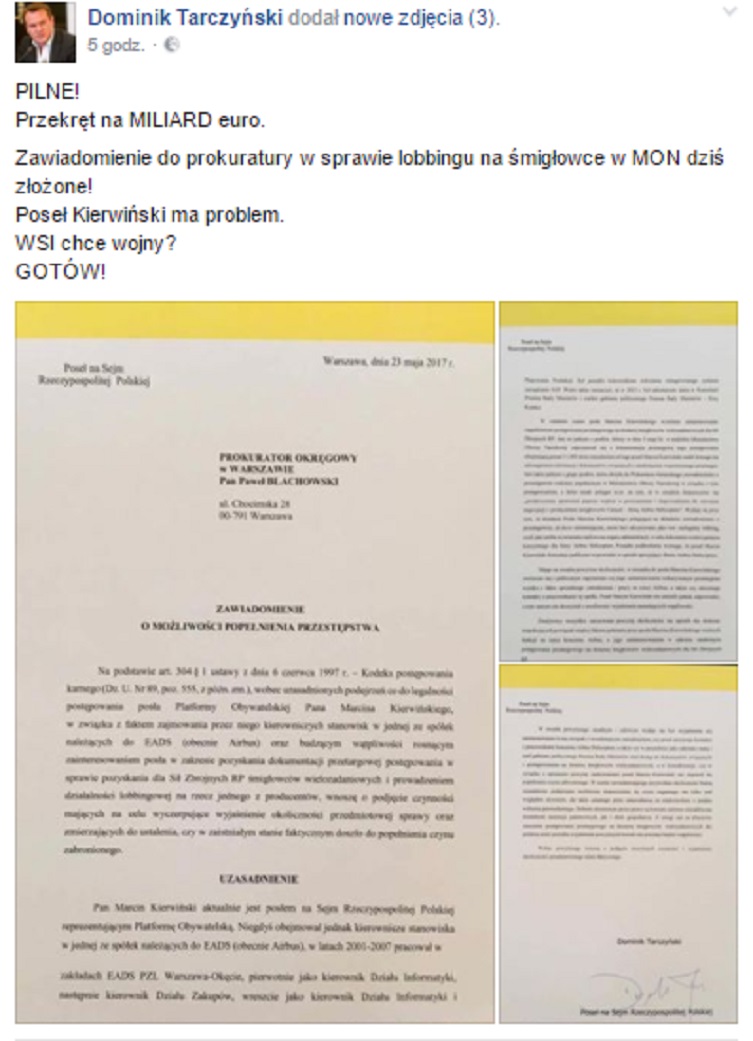 W ostatnim czasie- jak zauważa w swoim piśmie Tarczyński (poseł PiS opublikował na swoim profilu na Facebooku skany zawiadomienia do prokuratury)- polityk Platformy Obywatelskiej przejawia zainteresowanie zagadnieniem postępowania przetargowego na zakup śmigłowców dla polskiej armii. ZOBACZ SKANY NA FB