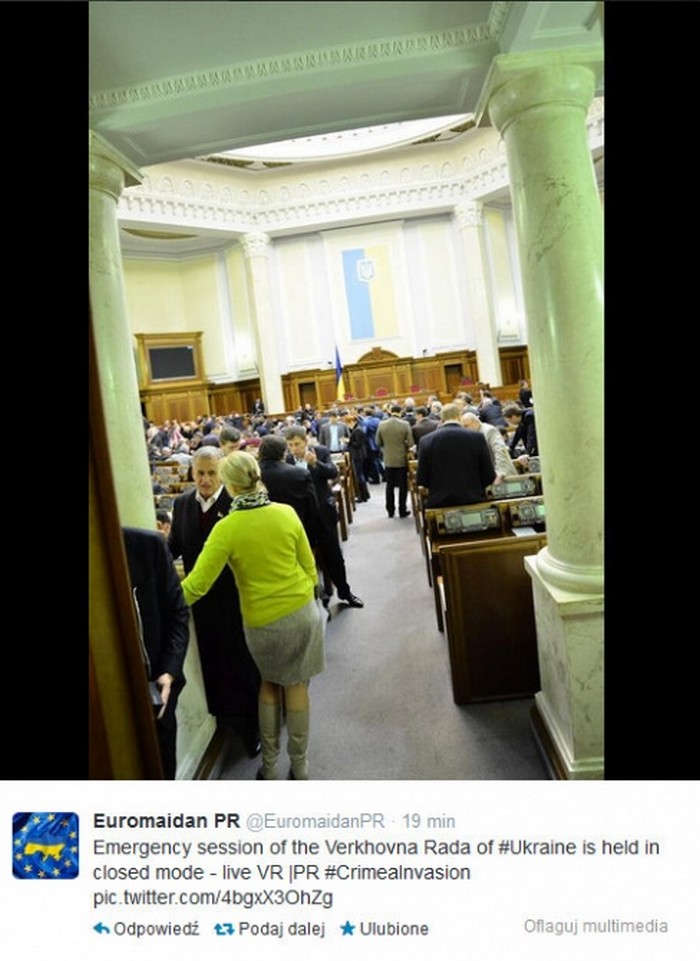Rada Bezpieczeństwa Narodowego i Obrony Ukrainy poleciła szefowi sztabu generalnego i dowódcom innych formacji wojskowych niezwłocznie postawić siły zbrojne Ukrainy w stan gotowości bojowej. Za zamkniętymi drzwiami trwa nadzwyczajne posiedzenie Rady Najwyższej Ukrainy. Ukraiński parlament może ogłosić wprowadzenie na terytorium kraju stanu wyjątkowego lub wojennego w związku z wczorajszą zgodą Rady Federacji Rosji na użycie wojsk rosyjskich na terytorium Ukrainy.